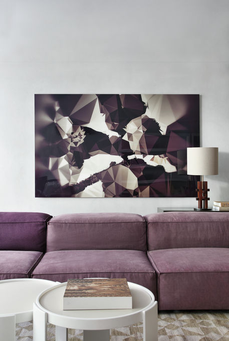 In the spacious lounge there are several settings. The modular sofa from Living Divani faces not only the sitting room space, decorated with smaller pieces of furniture, but also the TV and features oversized cushions. Near the window, a table designed by the architect is multipurpose: "Normally, it serves as a bar, but there's nothing to prevent you from using it as a home office." Beside the table, a vintage wooden screen provides privacy and a show of light and shadow. The vintage screen and the rattan couch are in complete contrast with the contemporary furniture, yet without creating any conflict in style.