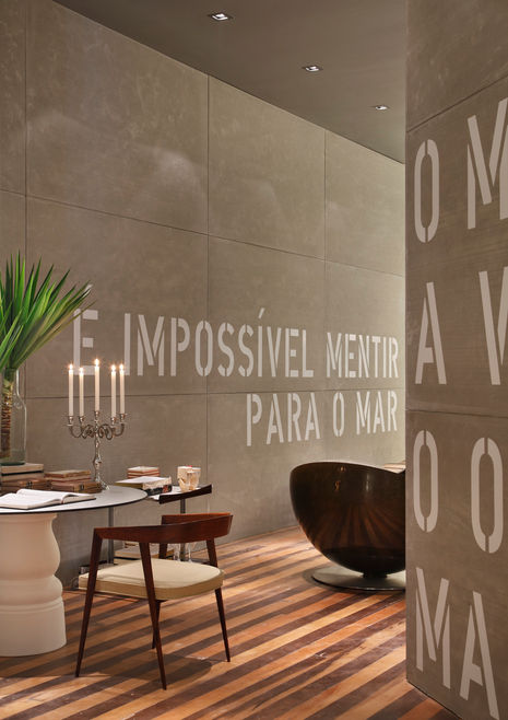 O sofá Otto, outro clássico de Guilherme, foi apresentado em versão "2.0" nas palavras do designer. Almofadas soltas no assento aproximam mais seu design de um Chesterfield, ponto de partida para sua concepção inicial. Poltronas e sofás de Sérgio Rodrigues, Ricardo Fasanello, mesas de Jorge Zalszupin em jacarandá, uma extinta madeira brasileira, criam a atmosfera atemporal desse espaço, que mesmo fechado é voltado para o mar, como cita a poesia de Antunes.