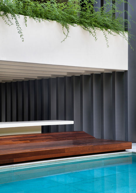 Outra assinatura do arquiteto no projeto foi o uso de pouquíssimos materiais de acabamento. Nesta morada, todos os pisos foram revestidos de granito branco levigado, inclusive a piscina. Uma pintura em cimento polimérico renovou as estruturas em concreto aparente, e as “cintas metálicas” que envolvem a arquitetura externa foram pintadas num tom grafite.